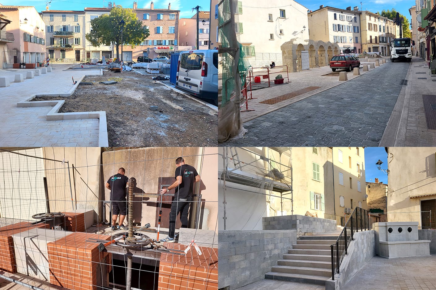 Based on the creation of a spectacular aeration of the urban fabric, through the demolition of an old communal building, the downtown redevelopment is underway for create a new centralityThese include the Agora (a ventilated square highlighting the town’s heritage and hosting a new green grid), the Place Gardanne (a heavily planted, permeable space, with some parking and comfort facilities), the Traverse du Vieux Moulin (and its rediscovered canal, a source of freshness), the Rue de la République (and its interface with the Place Général de Gaulle), and the Rue Pierre Brossolette, Rue Gabriel Péri and Rue Félix Pey (given back to pedestrians and commercial activity).