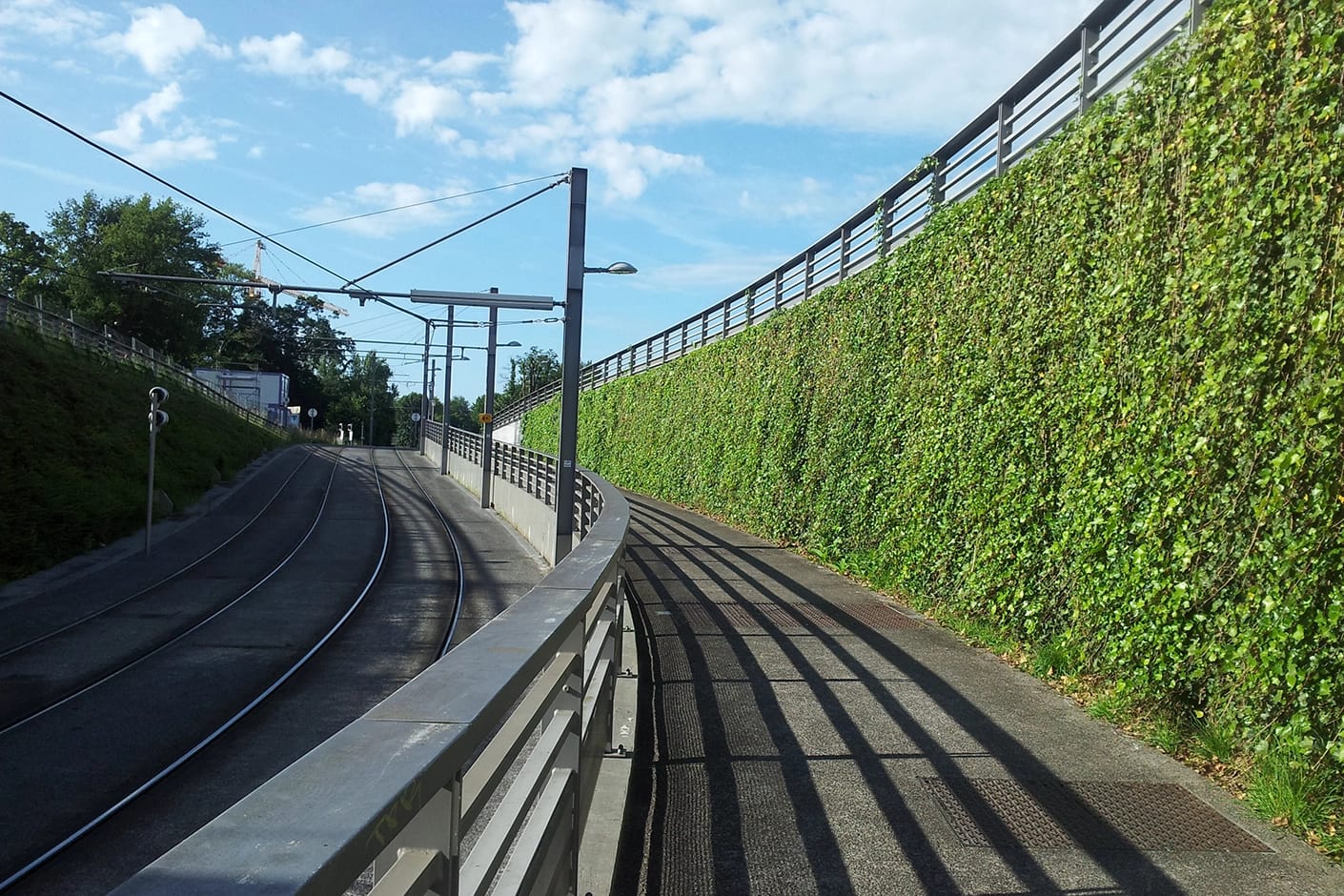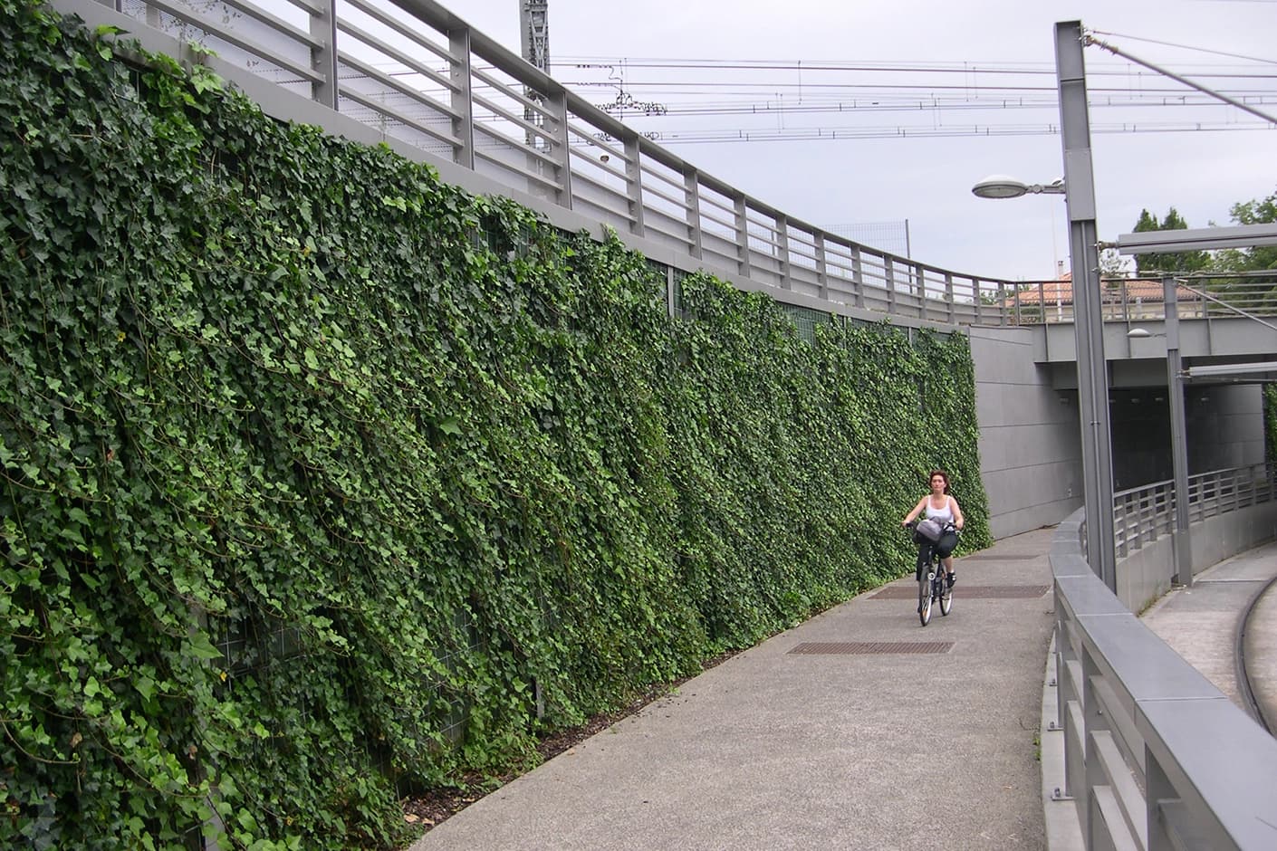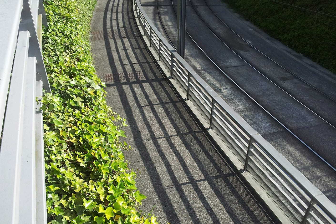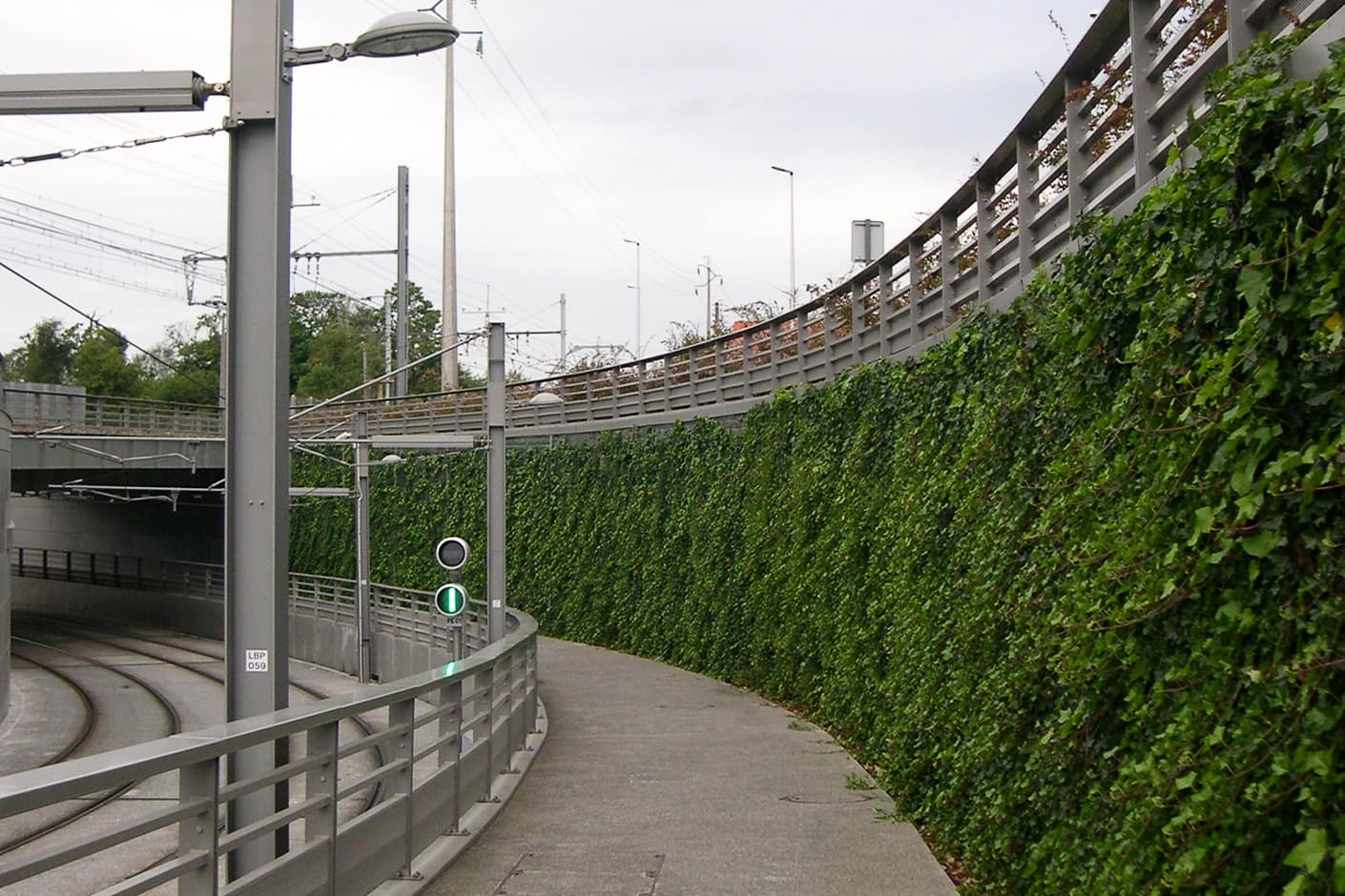 To support this gentle vocation, the hopper was designed with a strong plant presence, with the creation of a monumental wall planted with ivy, covering 80% of the linear length of the hopper. This wall, directly associated with the greenway, faces an embankment itself planted with shrubs, significantly reducing the rough technical nature of the structure.