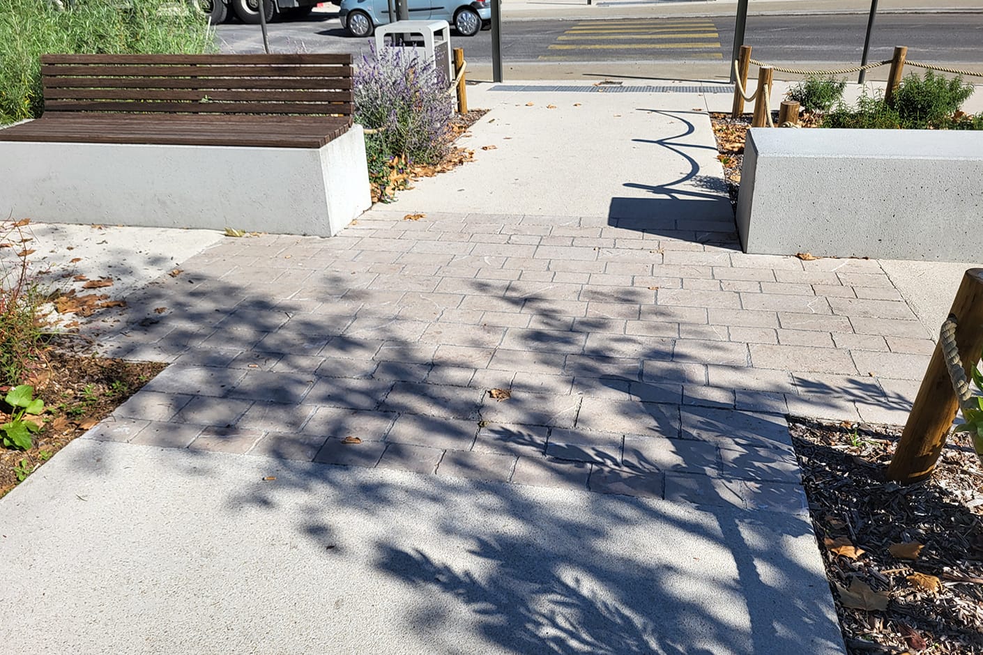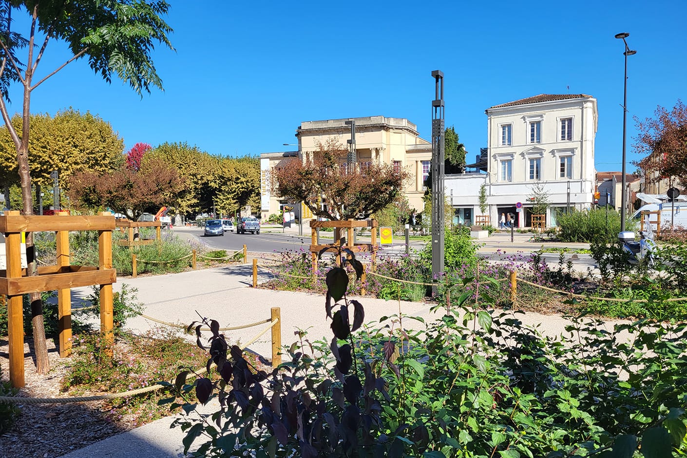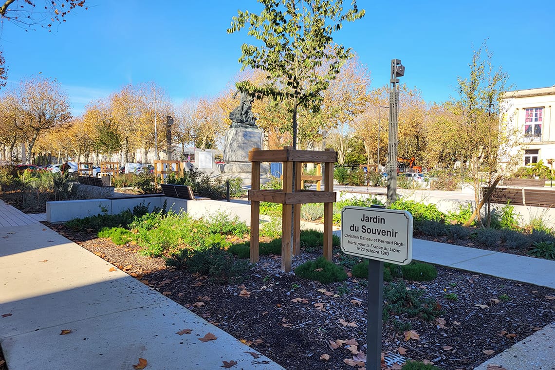 Ce projet nous a également conduit à requalifier le parvis du Théâtre Georges Leygues (classé MH) | Remplacer le mur du souvenir du Monument aux morts par des stèles individuelles plus légères et transparentes | Associer le Monument aux morts à un jardin du souvenir | Mettre en œuvre des cuves enterrées pour récolter les eaux des toitures pour l’arrosage | Transplanter des arbres existants directement sur le projet | Etc.