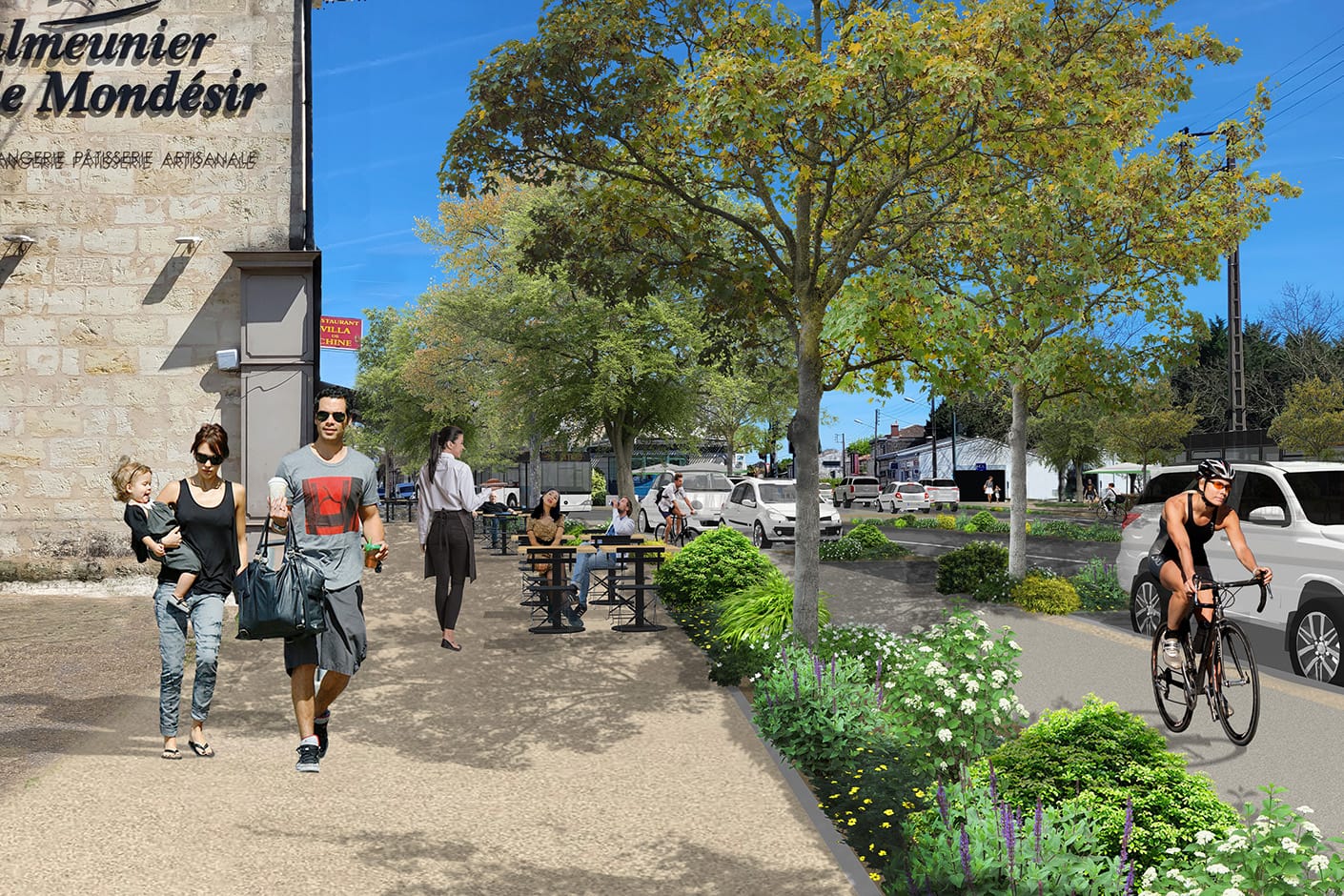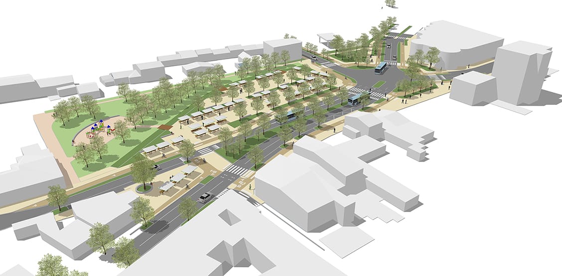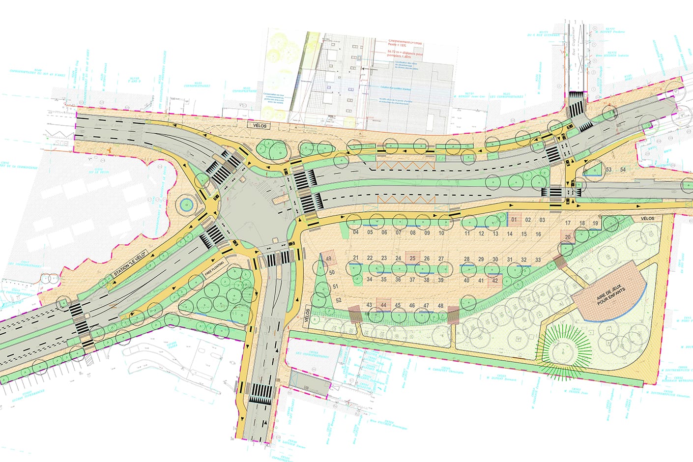 Notre proposition prévoyait une forte végétalisation de l’espace, la préservation intégrale d’un espace boisé existant (renforcé dans ses usages par la création d’une aire de jeux multi-âges et inclusive), un maillage cyclable complet.