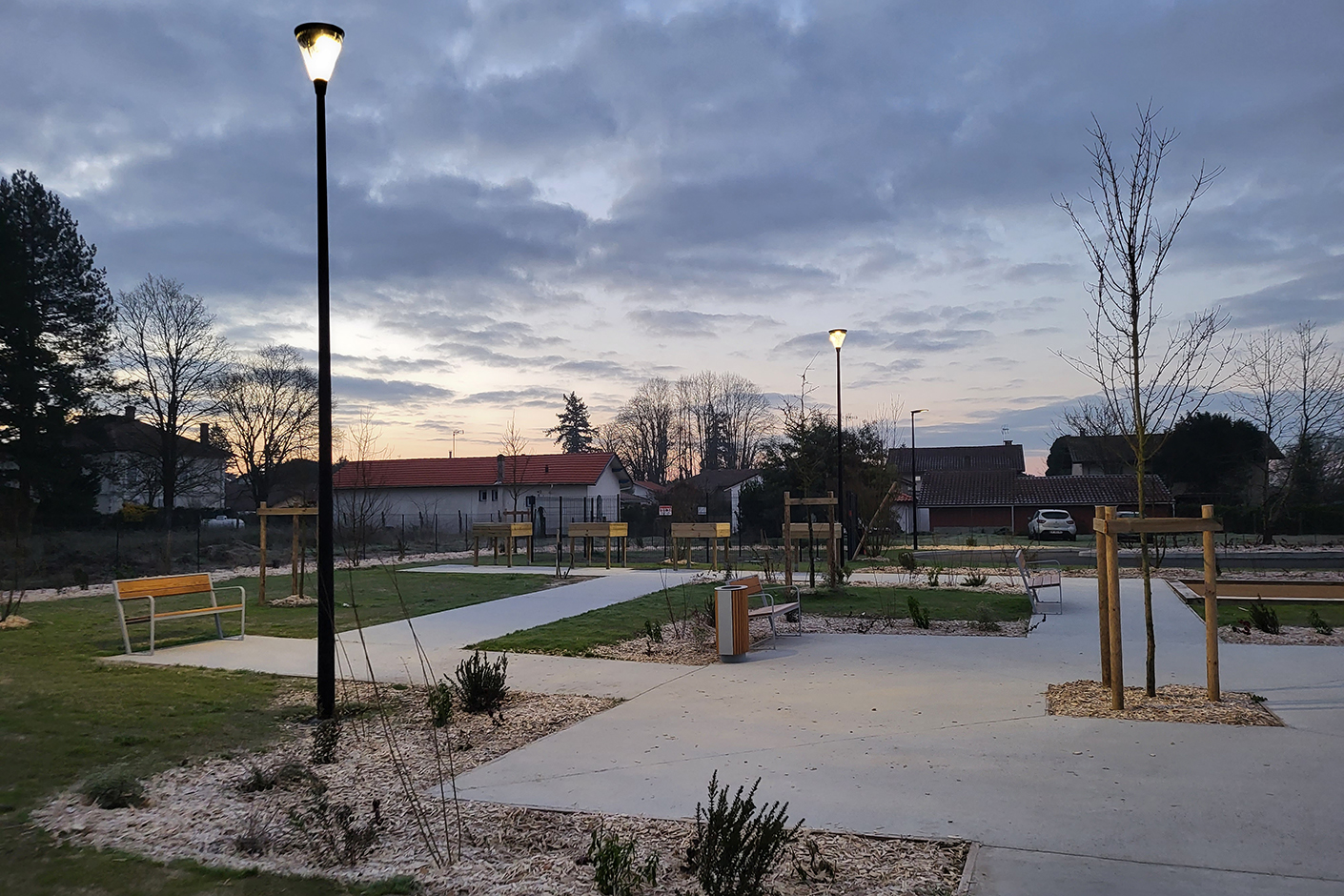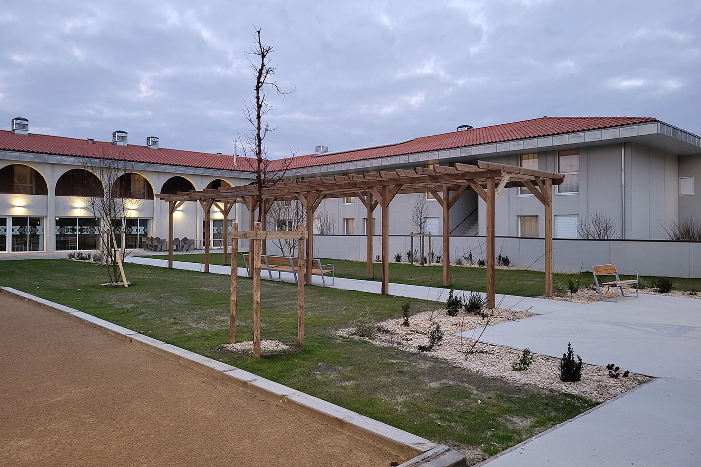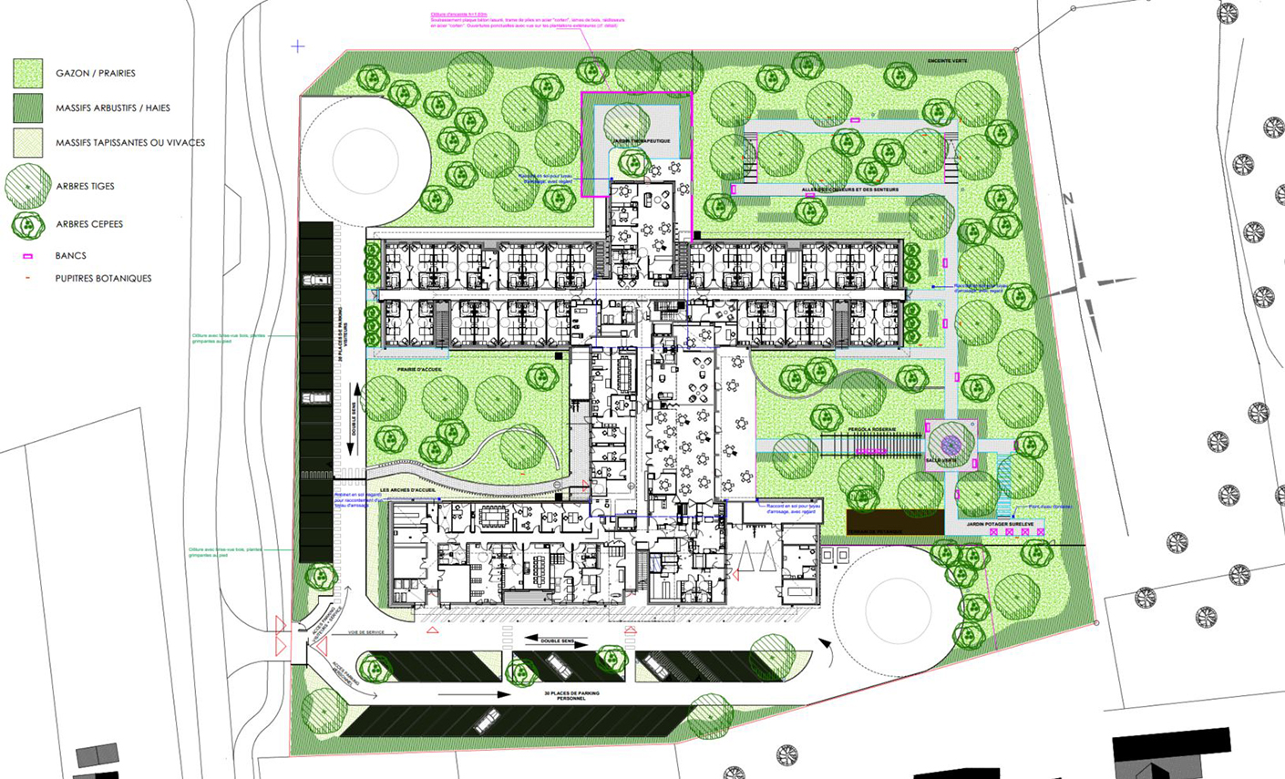 Parc : jardin thérapeutique, chemin des mobilités, chemin des senteurs, boulodrome, potager accessible, terrasse extérieure.