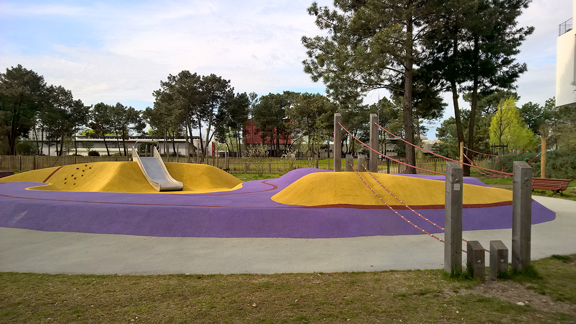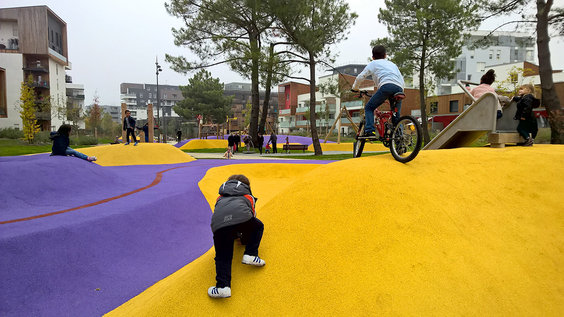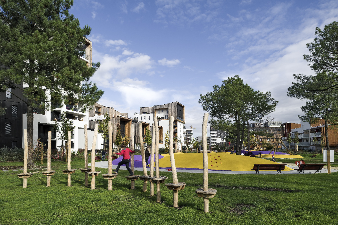 Aménagement du Parc Bühler, dans le cadre de la création de l’écoquartier labellisé GINKO. Parc écocertifié EVE. Parc comprenant notamment un amphithéâtre de verdure, un terrain sportif, des aires de jeux (Jardin du Clown Chocolat), des cheminements doux, des cabanes…