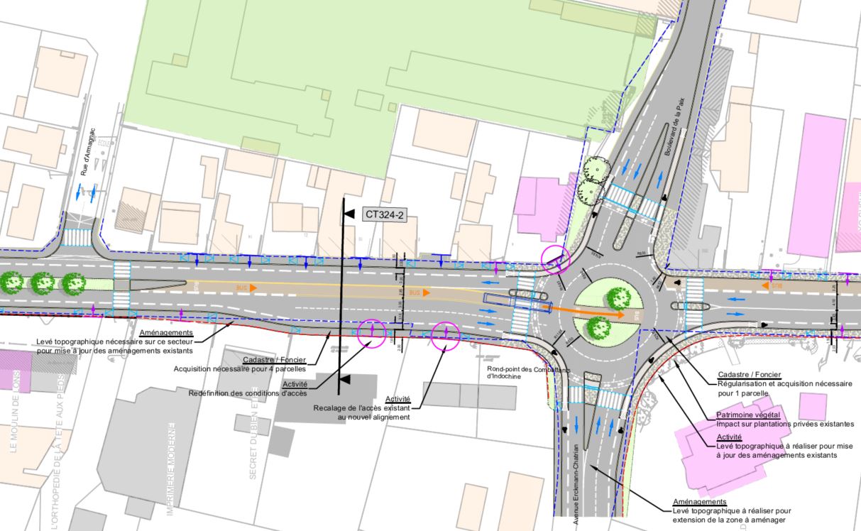 Création d’une nouvelle ligne de BHNS selon le concept du Chronobus, tout en intégrant la requalification de l’entrée de ville et de la pénétrante constituée par la Route de Bordeaux, de façades à façades.