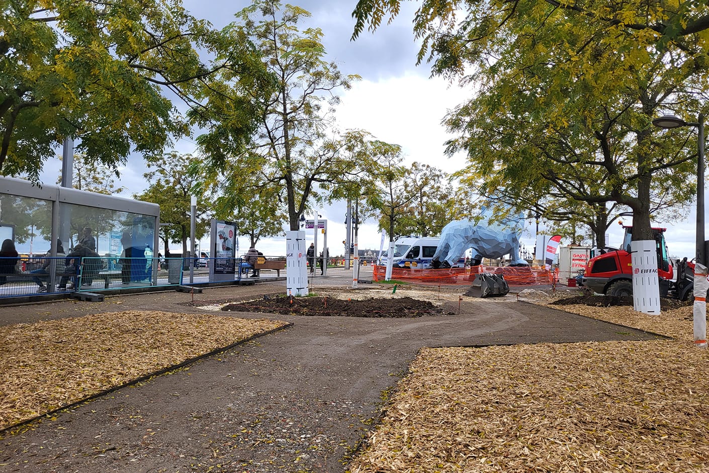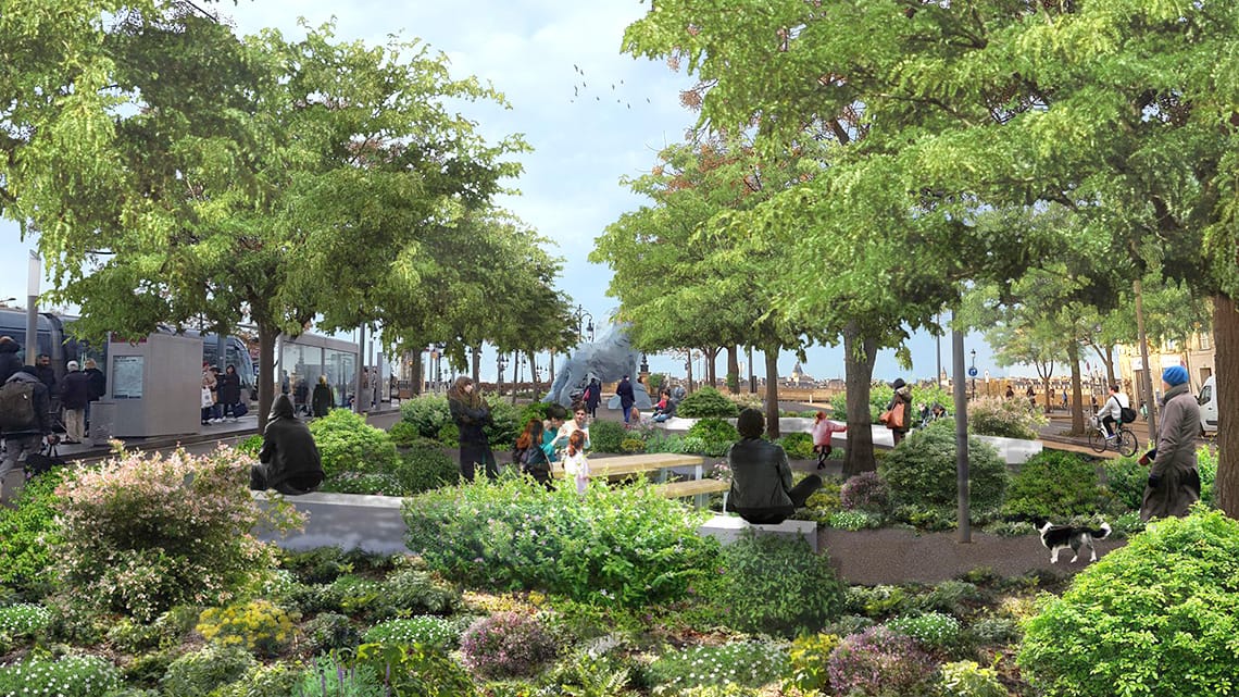 Tête du Pont de Pierre sur la Garonne et seuil emblématique de la rive droite, la Place Stalingrad porte une identité patrimoniale marquée (UNESCO) et celle d’un pôle d’échange multimodal d’envergure, associant le tramway de Bordeaux, les bus de ville, les cars régionaux, les vélos, les piétons. Aride et surfréquentée, la place a besoin de libérer son espace, de désimperméabiliser son sol de façon ambitieuse (seulement 0.8% de sa surface est perméable aujourd’hui), d’élever l’accueil et la fraicheur en duo structurant de sa requalification.