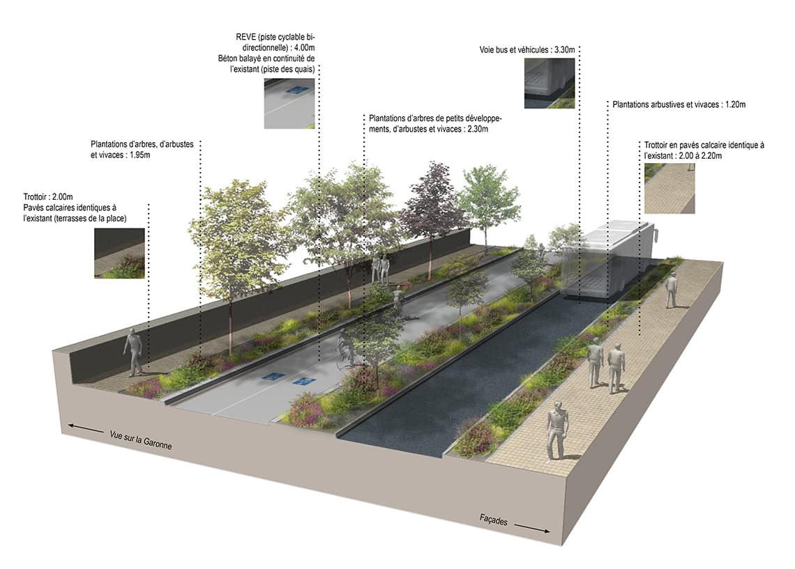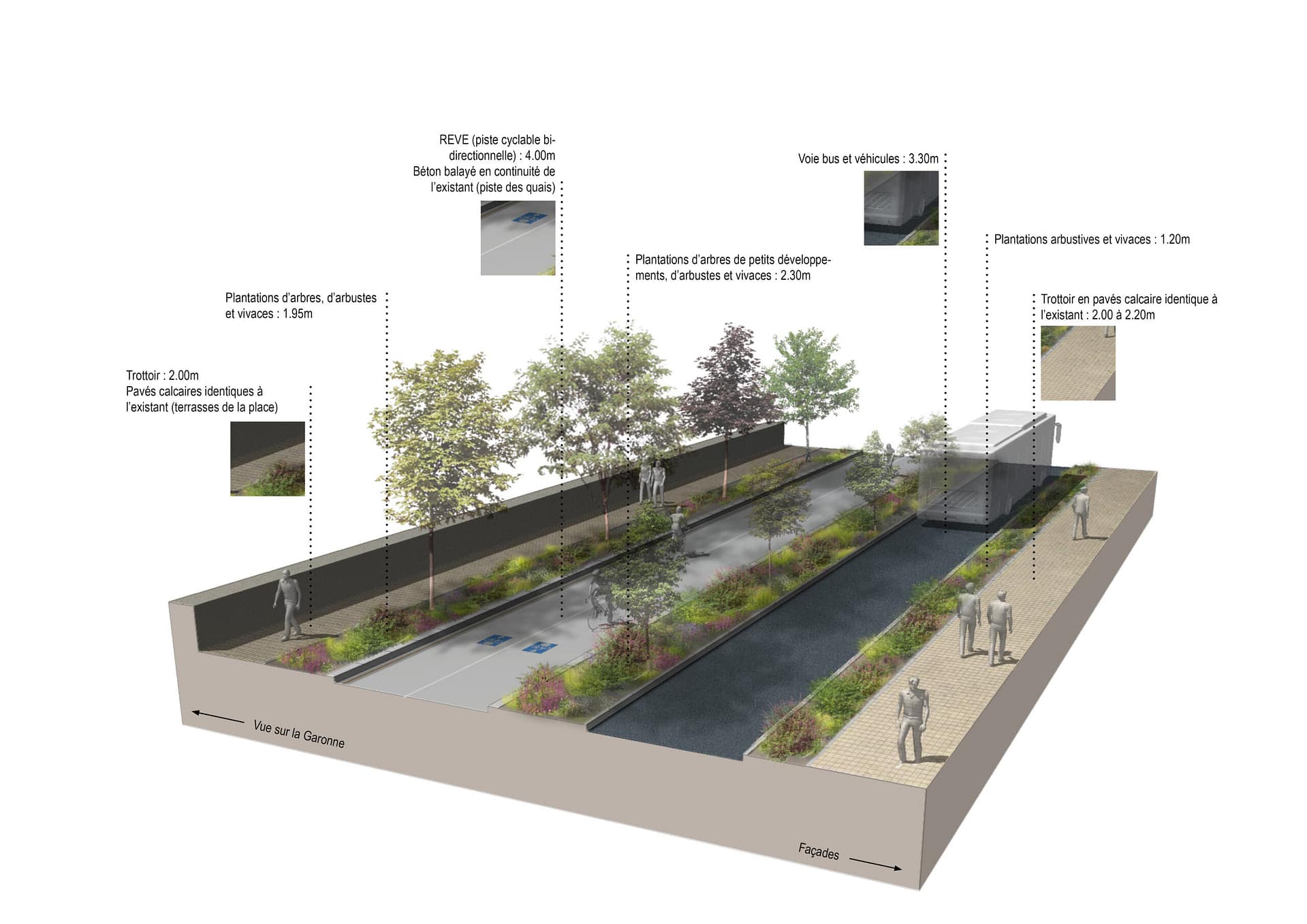 Le projet consiste en un réaménagement complet de la place et des rues et avenues attenantes : Quai Deschamps et Quai des Queyries. L’opération porte des enjeux forts de désimperméabilisation, de création de nombreux espaces verts et alignements, de redistribution des multiples arrêts de bus en intermodalité avec la Ligne A de tramway, de généralisation des cheminements cyclables dans le cadre du déploiement du Réseau Express Vélos (ReVE) de Bordeaux Métropole.