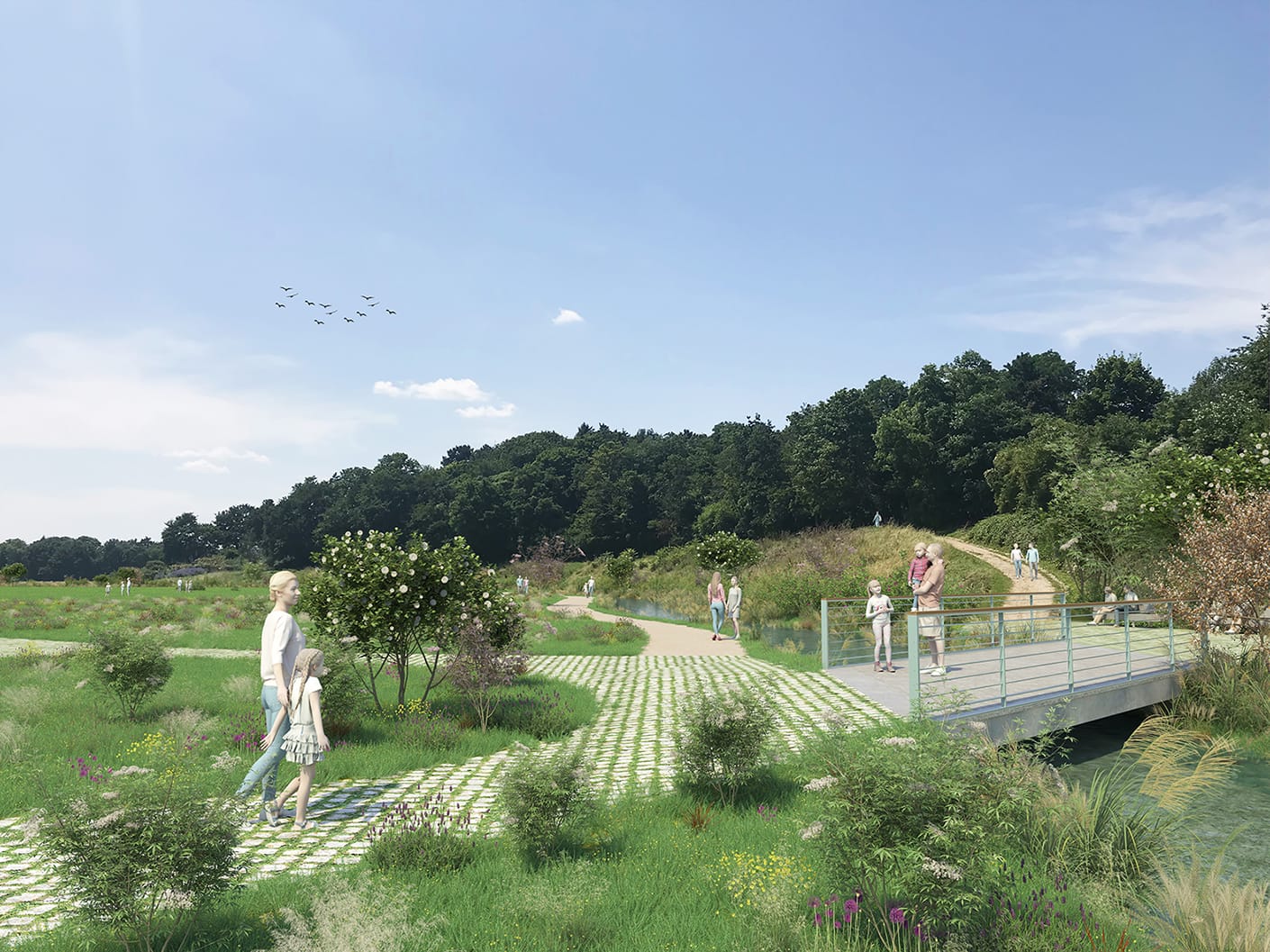 Aménagement des berges, création d’une circulation piétonne au bord de l’eau et de cheminements lourds, création de zones humides herbacées.