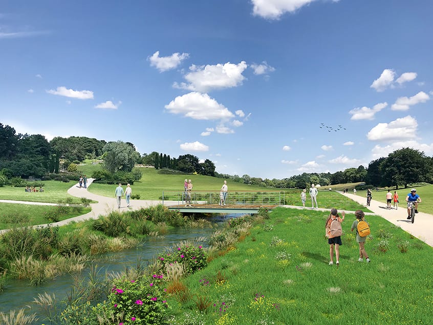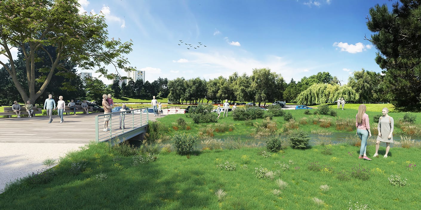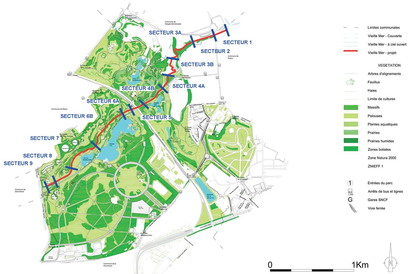 Le programme de l’opération consiste en la création d’un écoulement à ciel ouvert dans le cadre de la redécouverte de la Vieille Mer, sur le secteur du Parc Georges Valbon.