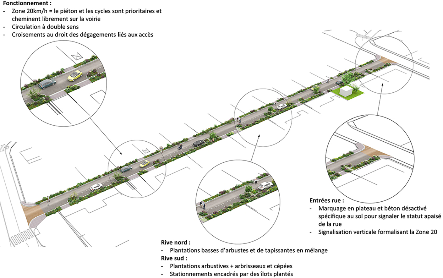 Suppression complète des trottoirs | Priorisation des modes doux de déplacement | Maintien du double sens de circulation sur la largeur utile d’une voie unique, création de sas de croisement.